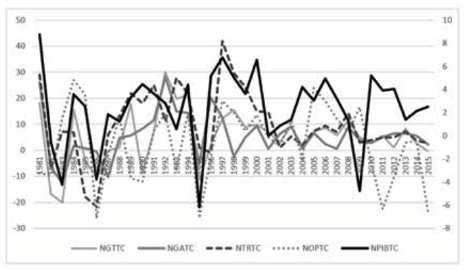 En segundo lugar, con base en la visión del ciclo clásico de Burns y Mitchell (1946), en la que el éste se identifica a partir de alzas y bajas en el nivel absoluto de las variables analizadas, se utilizan también sus tasas de crecimiento (TC), mismas que no solamente eliminan la tendencia subyacente de las series, sino que se pueden vincular a la sucesión de las fases de expansión y recesión del ciclo durante las cuales tomarán valores positivos y negativos, respectivamente, como sugieren Pérez et al. (2007).10 Cabe mencionar, además, que las tasas de crecimiento son una transformación comúnmente usada en el análisis económico.