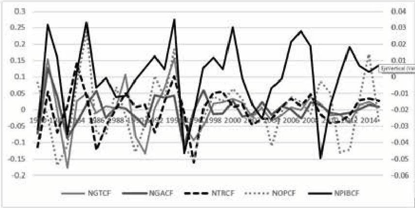 En la gráfica 1 se presenta el comportamiento de las tasas de crecimiento de las diferentes variables a nivel nacional donde se pueden destacar varios aspectos interesantes. El primero que llama la atención es el amplio rango de variación de las tasas de crecimiento de los diferentes rubros del gasto público[17], así como la declinación de su volatilidad, especialmente desde los primeros años de la década de los años noventa, con excepción de la de la obra pública. Segundo, se aprecia una cierta correlación positiva entre el crecimiento del PIB y el de los diferentes indicadores del gasto hasta aproximadamente mediados de la misma década y una relación inversa en torno a la Gran Recesión, lo que se explica por la instrumentación de políticas contra-cíclicas por primera vez en décadas en la economía mexicana (Banxico, 2009; Villagómez y Navarro, 2010). Aunque con alzas y bajas más pronunciadas, los patrones de los componentes cíclicos de las variables obtenidos con el filtro CF, en general, son similares a las de las TC, como se muestra en la gráfica 2.
