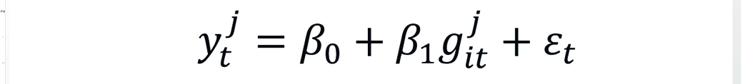 donde yt es la variable dependiente observada, xt la variable explicatoria y εt el término de perturbación que sigue un proceso ruido blanco; β0 y β1 denotan el intercepto y el coeficiente pendiente con valores constantes en la muestra. Se debe hacer notar que el tema de la causalidad no es relevante en este estudio, pues se trata de analizar solamente el co-movimiento entre las dos variables. En ese sentido, aunque se usa análisis de regresión, el coeficiente de correlación se puede obtener mediante una sencilla transformación.[12]