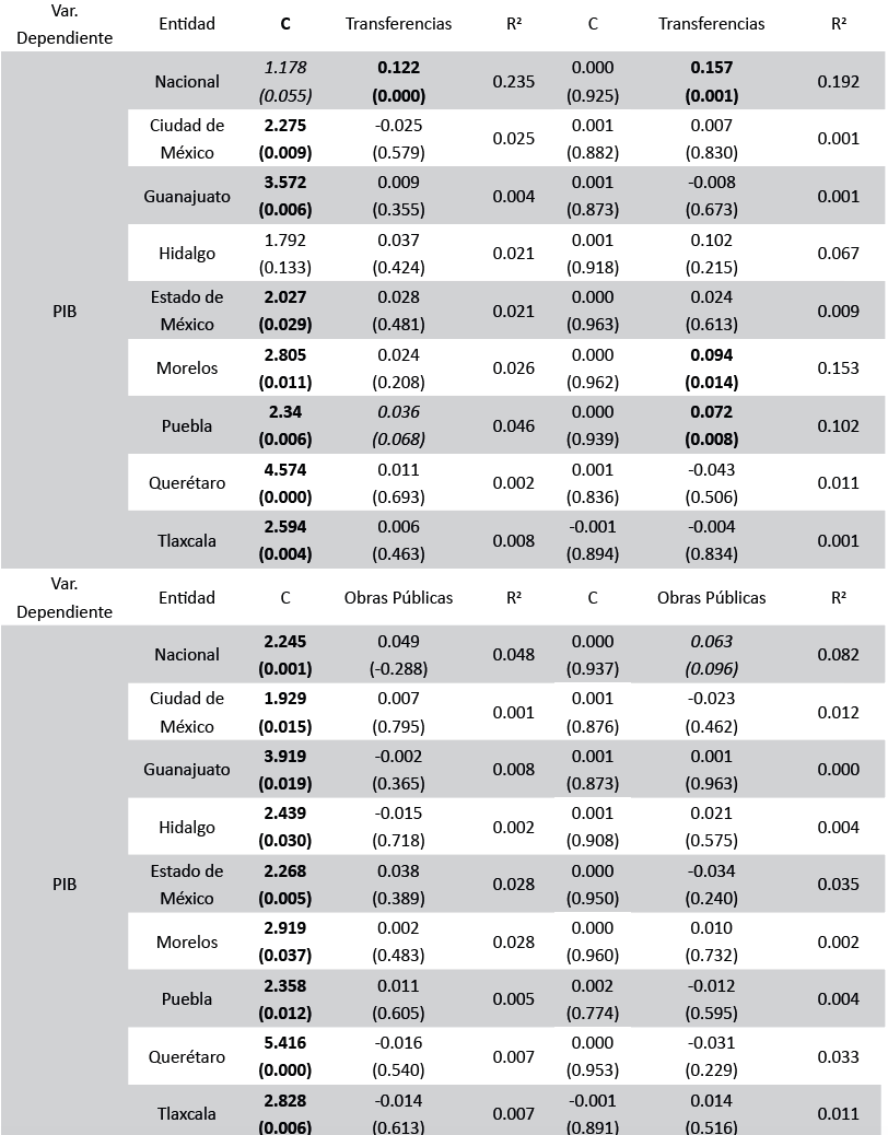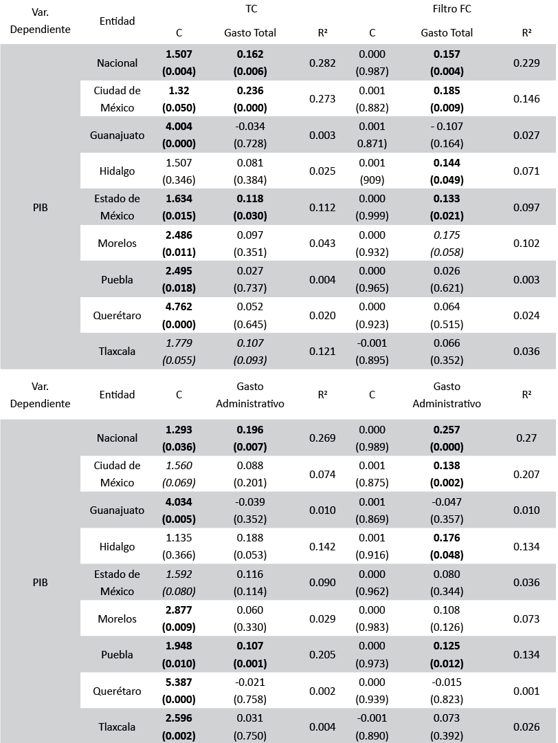 El análisis por estados, a su vez, sugiere relaciones positivas y robustas en la Ciudad de México, Hidalgo y el Estado de México, respecto a gasto total; la Ciudad de México, Hidalgo y Puebla en cuanto a gasto administrativo y, Morelos y Puebla referente a transferencias; en el resto de los estados, la gran mayoría de los coeficientes estimados son positivos, pero no significativos estadísticamente.