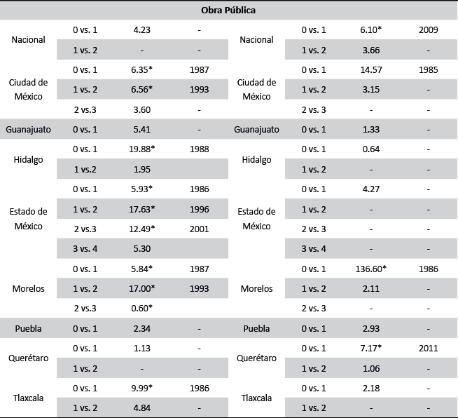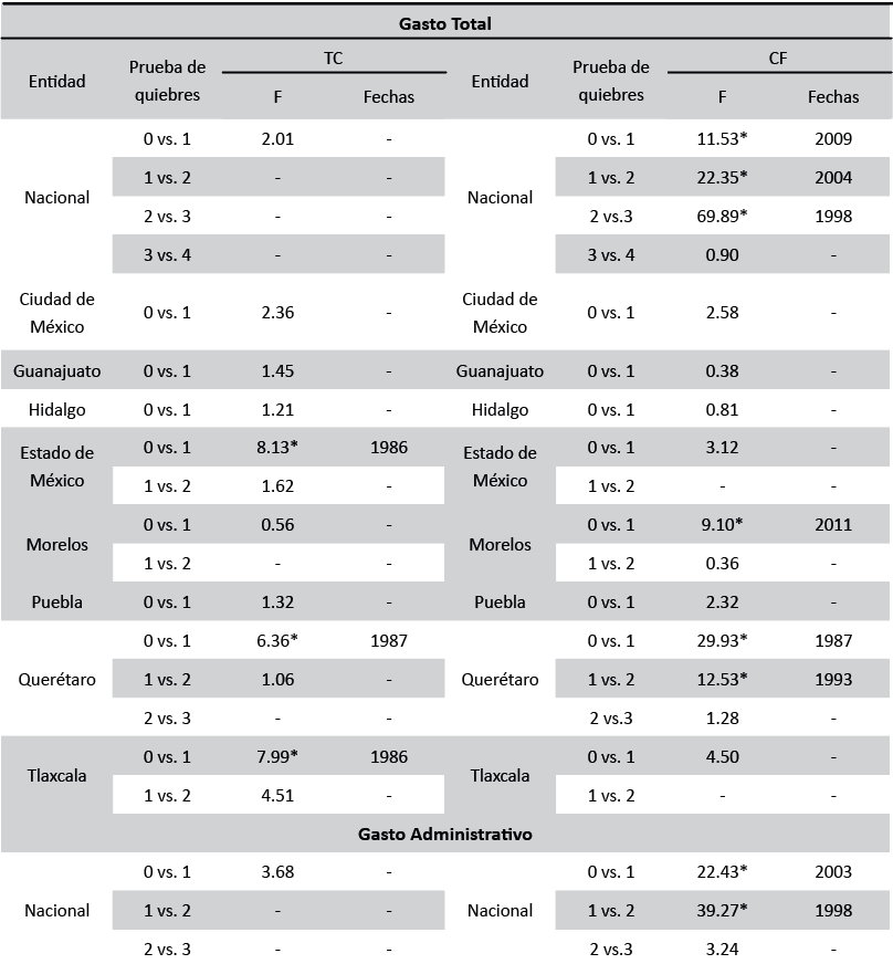 En general, se observa la presencia de múltiples quiebres estructurales, los cuales no se presentan necesariamente en las mismas fechas cuando cambia el método de eliminación de tendencia. De hecho, se detectan más quiebres cuando se usa el filtro CF que cuando se trabaja con las TC. Específicamente, a nivel nacional, no se identifican quiebres cuando se usan las tasas de crecimiento de las variables. En cambio, ocurren varios en la frecuencia del ciclo, cuando se usan datos derivados del filtro CF: una proporción importante de ellos ocurre durante la segunda mitad de los años noventa, cuando se transita claramente de una economía altamente inestable, con elevadas tasas de inflación y frecuentes devaluaciones cambiarias, fugas de capitales, alta volatilidad del precio del petróleo y bajo o nulo crecimiento, a una economía más estable. En ese proceso, además, se pasa de la aplicación de programas de estabilización basados, entre otras medidas, en elevados recortes del gasto público, al menos hasta la crisis de 1995, a un manejo prudencial del mismo fundamentado esencialmente en la disponibilidad de recursos fiscales.[19] Por otro lado, algunos quiebres ocurren en torno a la recesión de 2001-2003, mientras que otros más se presentan alrededor de la Gran Recesión de 2008-2009. Interesantemente en los modelos del gasto total, administrativo y de obra púbica nacionales se presentan quiebres en 2008 o 2009, lo que bien podría corresponder al cambio de orientación de la política fiscal para combatir la crisis, como sostienen Villagómez y Navarro (2010).