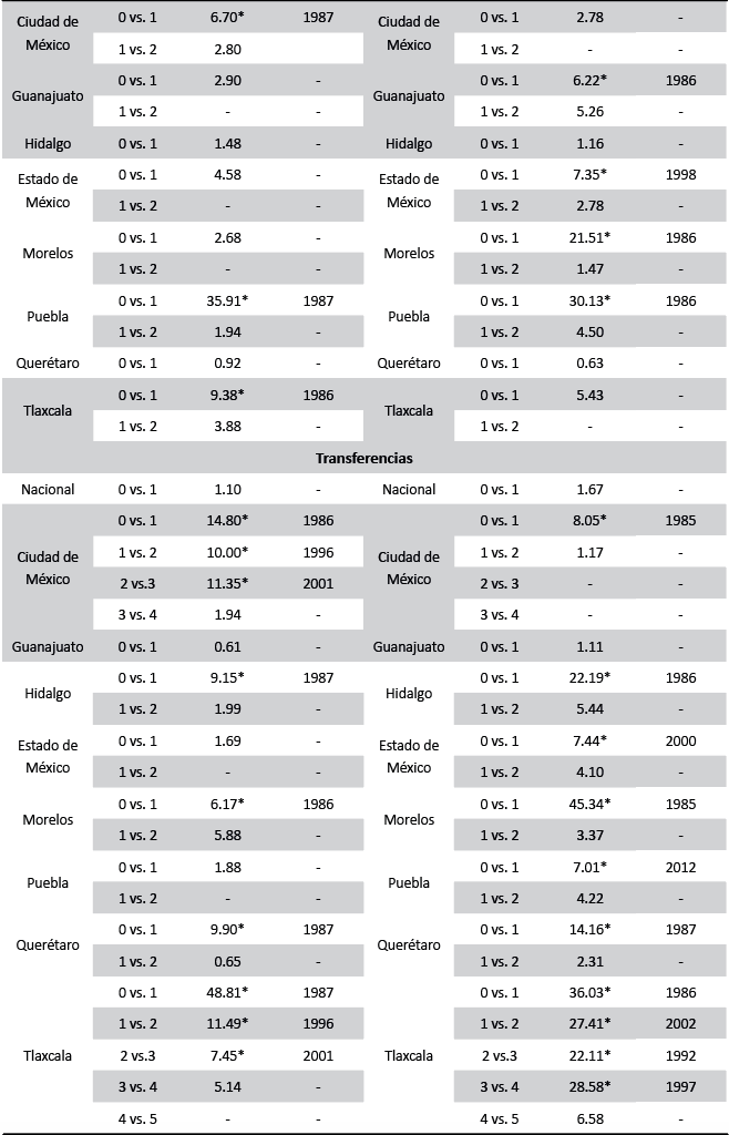 A nivel de estados, por otro lado, las fechas de los quiebres corresponden a periodos diferentes al caso nacional, ya que la mayoría se encuentran en la década de los años ochenta (principalmente entre 1985 y 1987), aunque algunos otros ocurren en los años noventa y sólo unos cuantos en torno a la Gran Recesión o a los años inmediatamente posteriores. Resulta importante mencionar que las fechas de estos quiebres podrían estar asociados a cambios en la Ley de Coordinación Fiscal (1998 y 2007) y a los efectos de la Gran Recesión en los fondos participables a los estados. En el primer caso, se crearon los fondos de aportaciones federales (Ramo 33) en el marco de la descentralización del Estado; la educación y salud pasaron formalmente a ser funciones de las entidades federativas, por lo que los rubros más importantes del Ramo 33 van destinados a estos conceptos. En el segundo caso, la Recaudación Federal Participable (RFP), de donde se toman los recursos para participaciones y aportaciones, disminuyó por la recesión, por lo que se activó el Fondo de Estabilización de los Ingresos Fiscales), llevando a una mayor asignación de recursos a las entidades federativas y municipios para amortiguar la caída en la RFP.[20]