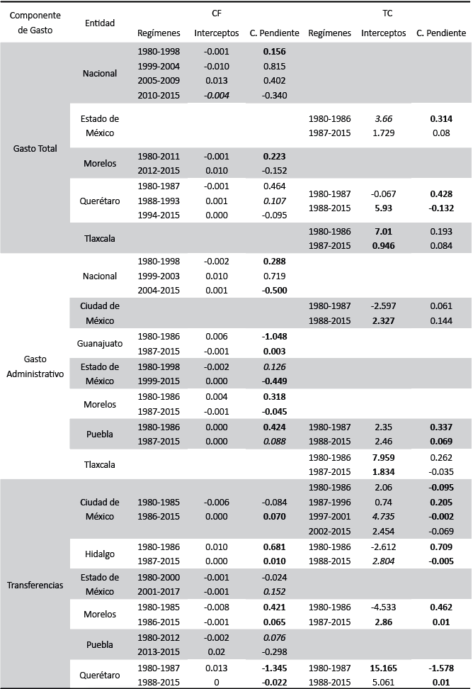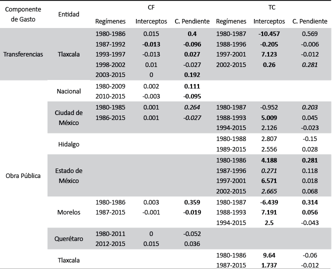 Las estimaciones de los coeficientes para los diferentes regímenes a nivel estatal ofrecen resultados menos claros y robustos, aunque se puede identificar algunos patrones interesantes. Primero, la mayor parte de los regímenes con coeficientes significativos se vinculan con quiebres que se presentan en los años ochenta, lo que, como se mencionó, puede explicarse por el cambio en la intensidad de las políticas de estabilización que hasta 1987 se basó en fuertes recortes del gasto público en las fases recesivas. Aunque después se mantuvo una política esencialmente similar, al menos hasta inicios de la década pasada, los ajustes fueron más moderados. Segundo, como consecuencia, los coeficientes pendiente positivos reducen su magnitud (y en ocasiones pierden su significancia estadística) cuando se pasa a regímenes más recientes, como en los casos del gasto total del Estado de México (TC), gastos administrativos de Puebla (CF y TC), transferencias de Hidalgo (CF) y de Morelos (CF y TC) y gasto en obra pública del Estado de México (TC) y Morelos (TC), por citar algunos ejemplos. Tercero, el coeficiente pendiente pasa de positivo a negativo en el gasto total de Querétaro (TC), gastos administrativos del Estado de México (TC) y Morelos (TC), transferencias de Hidalgo (TC) y gasto en obra pública de la Ciudad de México (CF).[22] Tercero, en muy pocos casos el coeficiente pendiente cambia de negativo a positivo, como en los gastos administrativos de Guanajuato (CF), las transferencias del Estado de México (CF) y de Querétaro (TC). Por último, llama la atención la gran cantidad de quiebres estructurales que se presenta en la relación del ciclo con las transferencias en el estado de Tlaxcala y la alternancia de los signos de dicha relación. No obstante, al parecer existe una relación robusta durante los primeros dos y el último régimen, tanto en términos de signo de la relación como de subperiodos de tiempo.