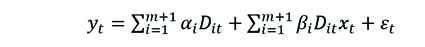 para los regímenes i = 1, … , m+1, donde se usan los índices (T1,…,Tm) para representar los puntos de quiebre desconocidos y, por convención, T0 = 0 y Tm+1 = T para indicar el inicio y fin de la muestra; Dit es una variable dicótoma que toma los valores de 1 para el segmento de la muestra Ti-1 < t < Ti y cero para cualquier otro caso (i = 1,…,m + 1). El propósito es estimar los coeficientes de regresión desconocidos αi y βi junto con los puntos de quiebre Ti cuando T observaciones de xt y yt están disponibles. Dado que el procedimiento es secuencial, se identifica al primer punto de cambio estructural como aquel en el que se minimiza la suma de residuos al cuadrado, denotado T̂ 1, así como los parámetros α1̂ y β̂1 y α̂2 y β̂2 del primero y segundo regímenes, tomando la muestra completa en la estimación.[13]Como paso siguiente, la muestra se divide en dos segmentos [1,T̂ 1 ] y [T̂ 1,Tm+1] y en cada uno se realiza el mismo procedimiento para estimar un nuevo punto de cambio estructural, y así sucesivamente.