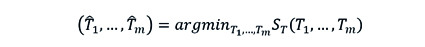 En general, como el método de estimación considerado se basa en el principio de mínimos cuadrados, para cada m-ésima partición (T1,...,Tm ) , denotado {Ti}, las estimaciones asociadas de αi y βi se denotan como α̂ ({Ti}) y β̂ ({Ti}). Sustituyendo éstas en la función objetivo y denotando el resultado de la suma de los residuos al cuadrado como ST (T1,…,Tm ) y los puntos de quiebre estimados como (T̂ 1,…,T̂ m ), tenemos que