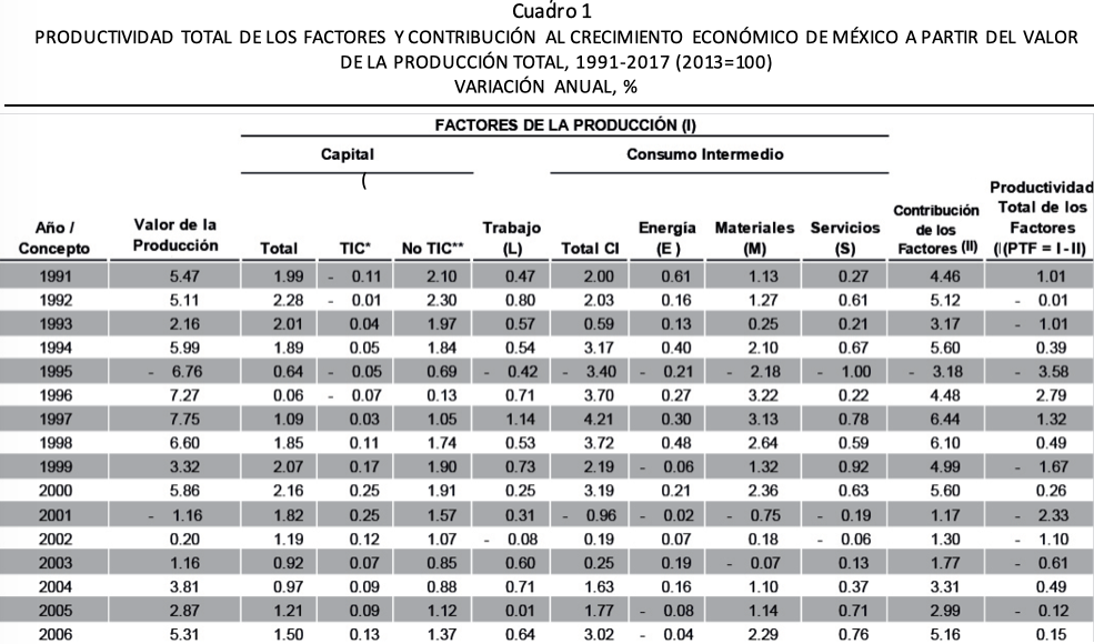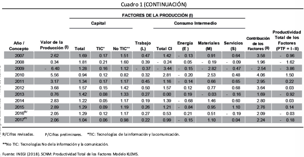 Inegi (2018). SCNM: Productividad Total de los Factores Modelo KLEMS. Año Base 2013. Serie 1990-2017 (Preliminar), Instituto Nacional de Estadística y Geografía. <https://www.inegi.org.mx/app/tmp/tabuladoscn/ default.html?tema=PTF> [17 de diciembre de 2018].