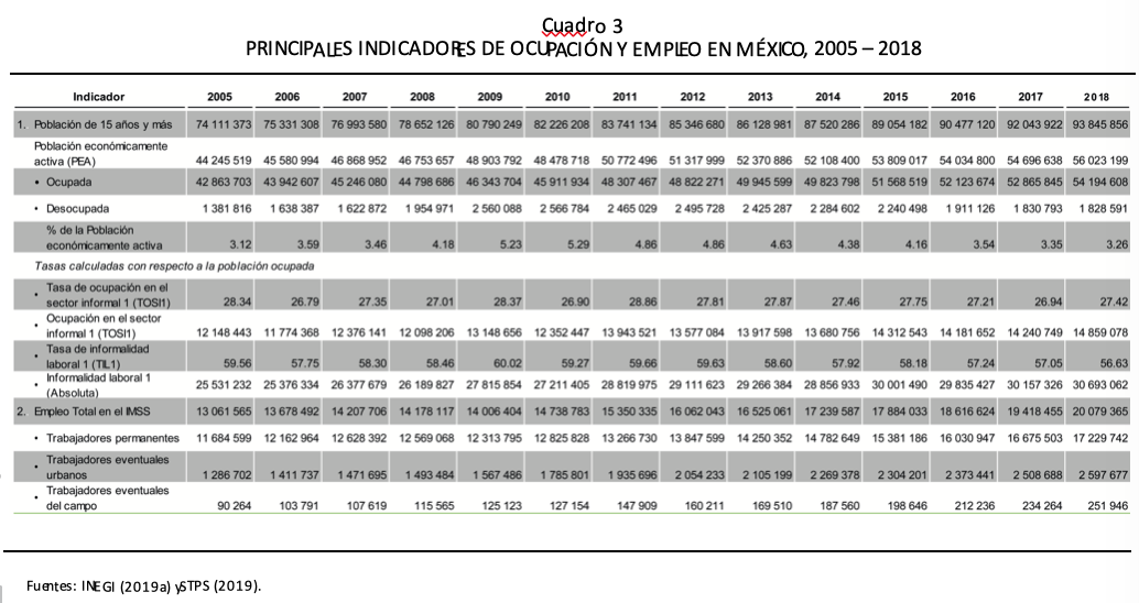 Desde finales de los ochenta, la política laboral en México ha sido tutelada por estos principios. El impacto a largo plazo ha sido la contención al crecimiento de la producción y el descenso de la productividad laboral, además de la extensión de la pobreza y desigualdad por todo el territorio nacional. A ello contribuyen las altas tasas de desocupación e informalidad, la tendencia a la baja del empleo permanente, el amplio uso de los esquemas de subcontratación y el lento crecimiento de los salarios reales. Al cuarto trimestre de 2018, la población económicamente activa (pea) era de 56 millones de personas, de las cuales 3.3% eran desocupadas. Esta tasa, que es corta en los estándares de la ocde, aún no se aproxima a la de 2005, cuando se ubicó en 3.1%, la tasa más baja en la historia reciente del país (cuadro 3). Su radio afecta a 1 millón 829 mil personas, las cuales se ven limitadas para satisfacer sus necesidades básicas por la ausencia de ingreso.