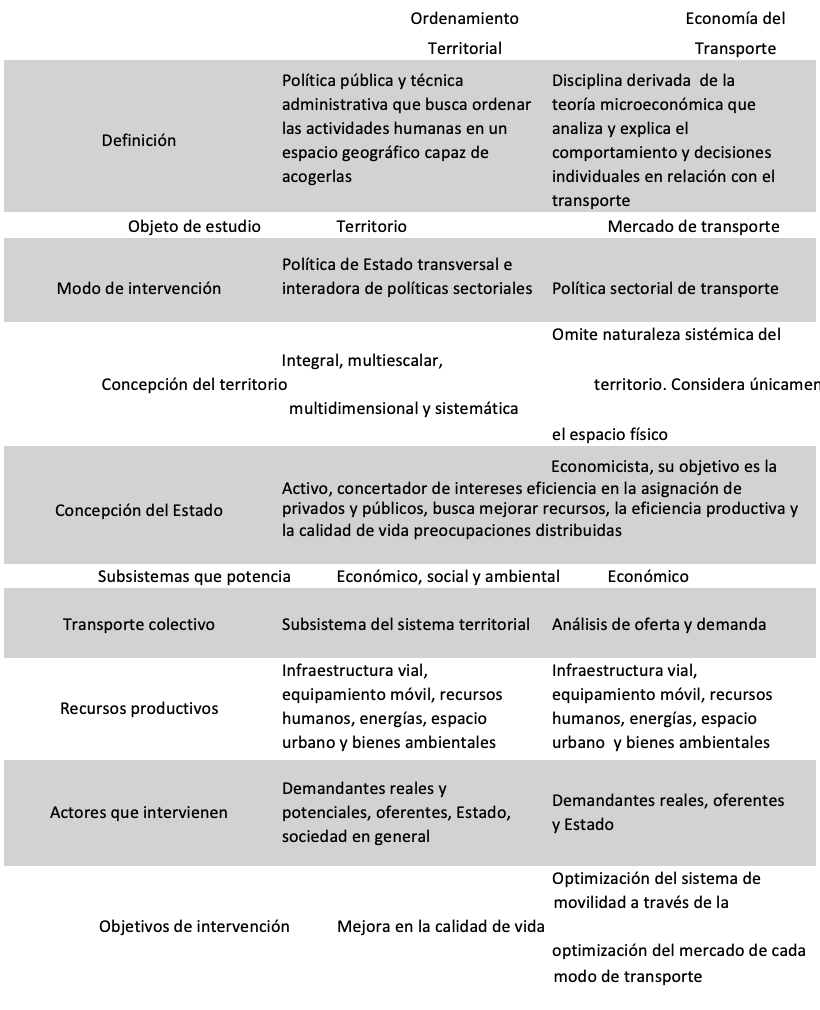 Una diferencia fundamental de estas dos perspectivas es que el ordenamiento territorial se constituye como una política pública y como una técnica administrativa, mientras que la economía del transporte es una disciplina técnico social proveniente de la teoría microeconómica, que se basa en conceptos, metodologías y teorías específicas. El ordenamiento territorial, por el contrario, en su carácter interdisciplinar, hace uso de dichos conceptos, metodologías y teorías y busca combinarlos de manera sistémica con aquellos propuestos por otras disciplinas. Es decir, el ordenamiento territorial emplea los postulados de las diversas disciplinas y los conjuga y complementa, en la medida que no sean contradictorios, para a partir del ellos generar políticas públicas integradas y transversales.