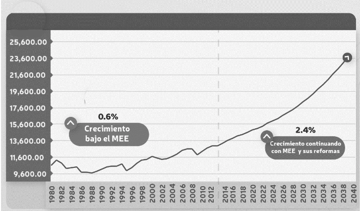 La OCDE (2015), aseguraba que el crecimiento resultaría de las reformas, esto a pesar de un entorno internacional adverso caracterizado por la reducción de los precios del petróleo y el endurecimiento de la política monetaria norteamericana, incluso afirmaba en este reporte que se podría crecer un punto adicional si se llevaba a cabo una reforma en el sector agrícola para reducir las restricciones al uso de la tierra y eliminar los subsidios; es decir, deteriorando aún más las condiciones del sector real de la economía. En la figura 1 aparece la tasa de crecimiento promedio observada del producto por persona anual versus las estimaciones de la OCDE, de 0.6% en 1980-2013 se pasaría a 2.6% entre 2014-2040.