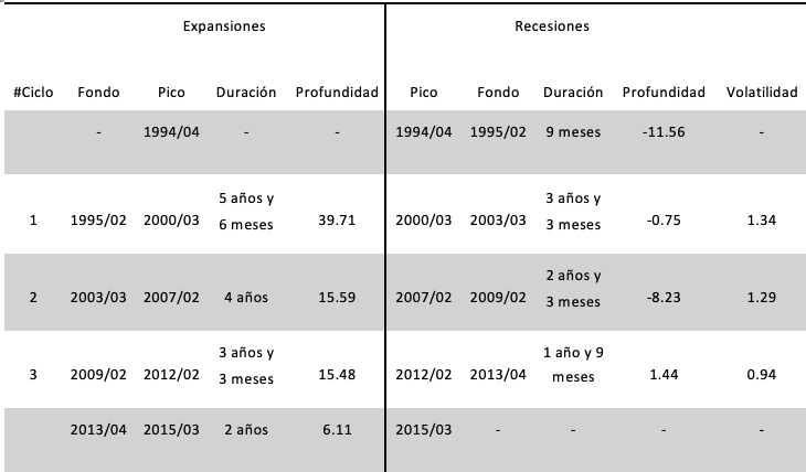 Para identificar los ciclos del crecimiento en México se utilizó el filtro Hodrik-Prescott, el cual permitió descomponer la serie del pib real a precios del 2013 en sus componentes tendencial y observado y a partir de aquí el ciclo. Dado que la serie utilizada correspondió al periodo 1993/01 a 2017/03, se detectaron tres ciclos completos. Para la referencia técnica sobre el cálculo de los ciclos, véase Sánchez-Juárez (2019).