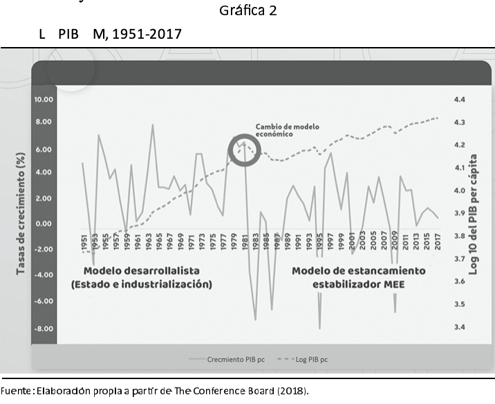 Entre 1980 y 1989 el decrecimiento per cápita fue 0.03%, de 1990 a 1993 creció 1.99%, 1.75% de 1994 a 1999 y 0.94% del 2000 al 2017, con lo que la economía mexicana se encuentra estancada desde hace treinta y ocho años (The Conference Board, 2018). Salvo los primeros años de la década de los noventa, el crecimiento ha sido bastante mediocre, aún más si se le compara con lo logrado en un pasado un poco más lejano, los últimos momentos del modelo desarrollista, entre 1970 y 1980 cuando la economía creció 3.36%. El crecimiento económico en México se caracteriza por su volatilidad, insuficiencia y desigualdad (ver gráfica 2).