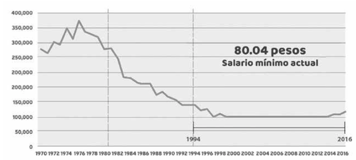 Con cifras proporcionadas por el Coneval, en su portal en línea, se sabe que en 1994 el ingreso mensual por persona era de 3,322 pesos; en 1996 bajó a 2,200 pesos; en 2002 fue de 3,100 pesos; en 2006 fue 3,350 pesos el máximo alcanzado durante la era tlcan; en 2010 2,900 pesos y en 2014 3,015 pesos reales, con lo que es menor al existente en 1994, lo que revela el deterioro sufrido.