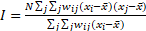 Sobre la segunda relación referida supra, para formalizar la interacción espacial entre las regiones con respecto a las variables incluidas en la presente investigación, verificamos formalmente la dependencia espacial a través del índice I-Moran. Lee (2001) señala que el I-Moran global es un índice de covariación entre regiones y fluctúa entre -1 y 1; cuando tiende a 0 implica que no hay autocorrelación espacial, mientras que si lo hace a -1 o a 1 está presente la autocorrelación espacial. La fórmula de cálculo del I-Moran es la siguiente: