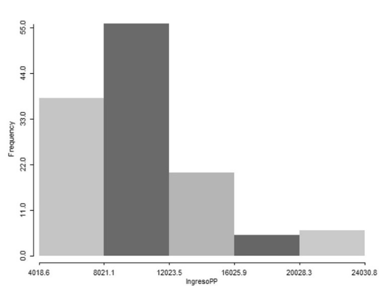 El histograma muestra la frecuencia de las observaciones agrupadas y obtiene las medidas de tendencia central de los datos analizados: frecuencia, rango, media y desviación estándar (Chasco-Yrigoyen, 2009). Por su parte, los mapas consisten en la representación cartográfica de una variable geográfica que, mediante símbolos y colores, la ponen de manifiesto en cada una de las unidades geográficas consideradas (Chasco-Yrigoyen, 2009); se enfocan en resaltar los valores atípicos en los datos (Anselin, Syabri y Kho, 2006) espaciales, concentraciones de datos cuyo valor se encuentra a cierta distancia de la tendencia general (mediana); en los usados en el AEDE, los datos se dividen y agrupan en una serie de categorías (cuantiles) con igual número de observaciones (Chasco-Yrigoyen, 2009).