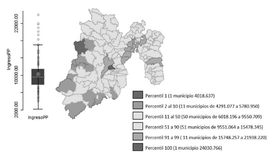 En este indicador se observa una cantidad importante de outliers, representados como puntos en la parte superior del diagrama de caja (Mapa 5): Atizapán de Zaragoza, Coacalco, Ixtapaluca, Tecámac, Huixquilucan, Naucalpan, Cuautitlán, Tlalnepantla, Metepec, Cuautitlán Izcalli y Toluca. Metepec es el de mayor ingreso, con 24,030.76 dólares anuales; por el contrario, San José del Rincón, localizado al oeste de la entidad y marcado en tono claro, cuenta con el ingreso más precario, que es de 4,018.63 dólares (PNUD, 2014).