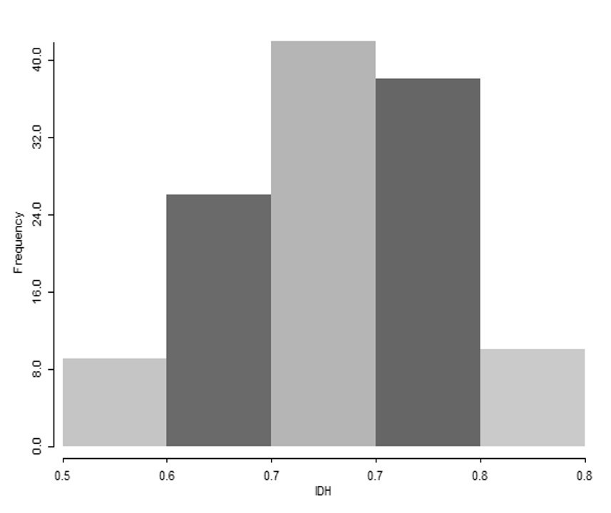 A diferencia del ingreso, el IDH se distribuye de forma más homogénea con una media de 0.6901 y una desviación estándar pequeña de 0.05933, lo que significa que su media se concentra en torno a 83 municipios, es decir, implica un nivel moderado de desarrollo (entre 0.633077 y 0.74943); por ello, en el box map se encuentra en el centro (Mapa 6), con un ligero sesgo a la derecha en su histograma de frecuencias, como se aprecia en la Gráfica 5 (PNUD, 2014).