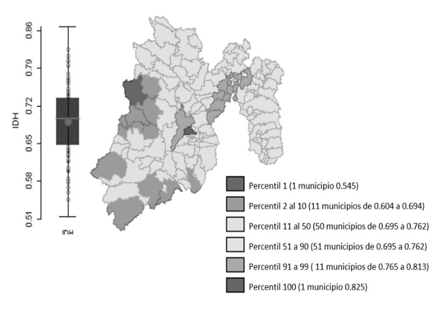 En este análisis se usan datos de corte transversal de los 125 municipios del Estado de México correspondientes a 2010, para cada una de las variables del IDH; se estudian éstas a través del histograma, el mapa de cuartiles y el box map.