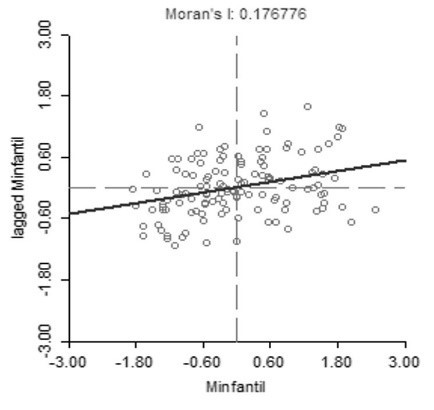 En el caso de la mortalidad infantil, pese a que existe correlación espacial positiva, no resulta contundente: tiene un I local de Moran de 0.1767 (Gráfica 6), de manera que los puntos se encuentran dispersos en los cuatro cuadrantes, no concentrados entorno a la línea recta, evidencia de que este fenómeno se presenta aleatoriamente en el territorio.
