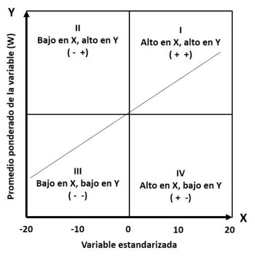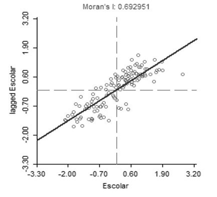 Este diagrama (Figura 1) muestra cuatro tipos de conglomerados espaciales, dos de autocorrelación positiva y los otros, negativa (ChascoYrigoyen, 2009), distribuidos en cuadrantes: el primero y el tercero (alto-alto, bajo-bajo) indican la presencia de autocorrelación positiva, es decir, el comportamiento de una variable en algunas regiones es favorecido por su comportamiento en zonas próximas; por otro lado, el segundo y cuarto cuadrantes (bajo-alto, alto-bajo) reflejan la existencia de autocorrelación espacial negativa, dado que el comportamiento de un fenómeno no está relacionado con efectos en los territorios vecinos (Aroca-González, 2000; Anselin, 1994).