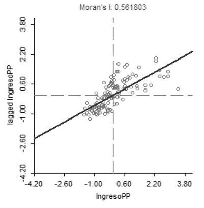Una vez construida la matriz de pesos espaciales se procede al cálculo del índice, representado gráficamente mediante un diagrama de dispersión conocido como diagrama de Moran, obtenido a partir de la expresión matricial del I (Aroca-González, 2000); en él se representan la variable estandarizada en el eje X y el retardo espacial2 en el eje Y; la pendiente de la línea de regresión corresponde al I de Moran (Anselin, Syabri y Kho, 2006).