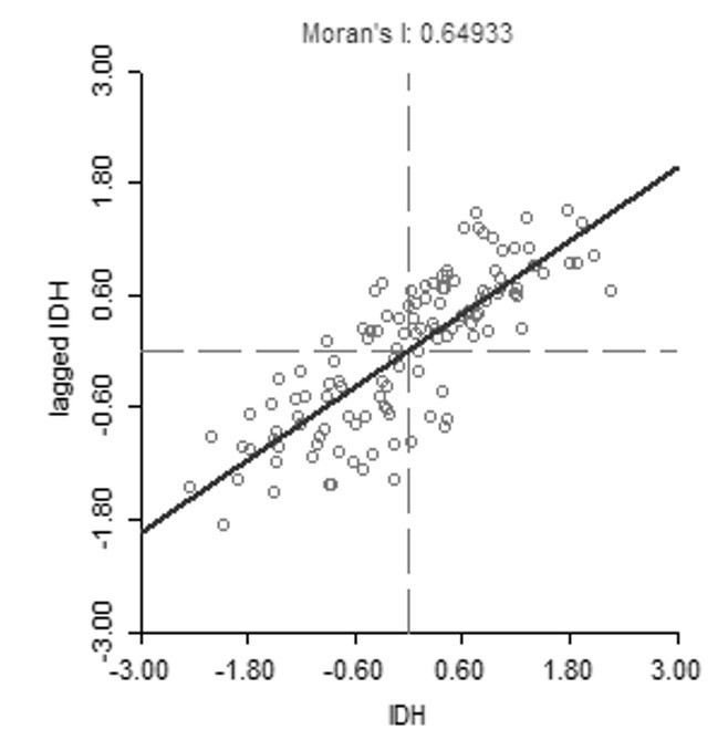 Finalmente, se encontró que el I local de Moran para el IDH en los municipios mexiquenses fue de 0.6493 (Gráfica 10), lo que demuestra que para la entidad el bajo o alto desarrollo humano no se distribuye de manera aleatoria. En este caso, existen hot spots y cold spots dentro de los cuadrantes I y III, los cuales representarían clústers perfectamente definidos de territorios con alto y bajo IDH, cuya autocorrelación espacial implica condiciones de vecindad con municipios de IDH semejante.