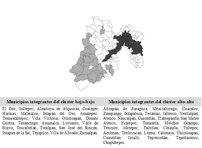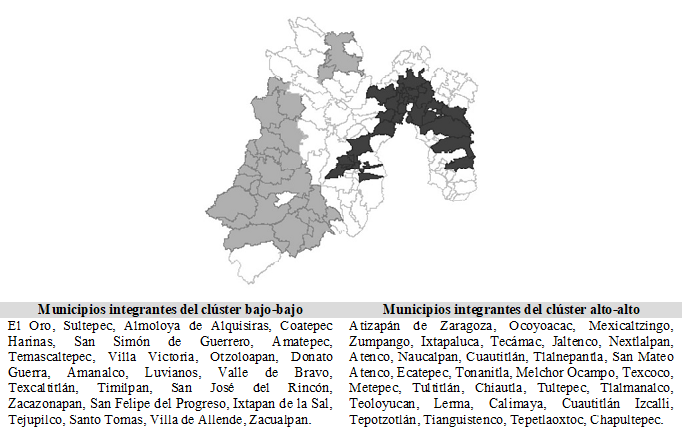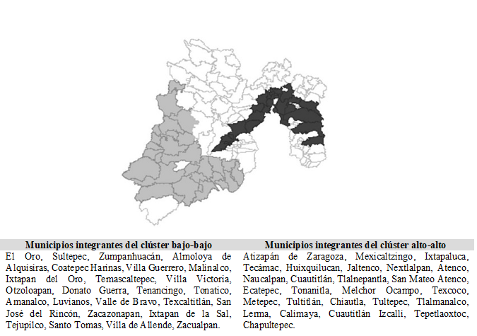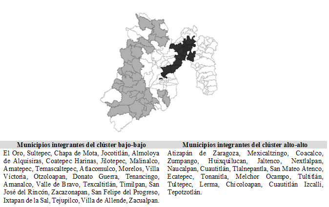 La existencia de clústers bajo-alto, o alto-bajo, en el análisis del IDH, y sus componentes educación e ingresos, demuestran una divergencia muy marcada del desarrollo en esta entidad: por un lado, cuenta con un territorio rico y una población con alto grado de educación, salud e ingresos; y por otro, una región pobre y personas con bajos niveles de progreso, ingresos y educación. Tal parece que, a partir de la concentración poblacional en los dos grandes polos de atracción económica de este estado, Ciudad de México y Toluca, ha tenido lugar a una heterogeneidad en muchos de los fenómenos económicos y poblacionales, mientras ha dejado al descubierto la existencia de otras dos regiones con rasgos de desarrollo opuestos, donde se deben de realizar esfuerzos por buscar alternativas viables para mejorar las condiciones de vida.