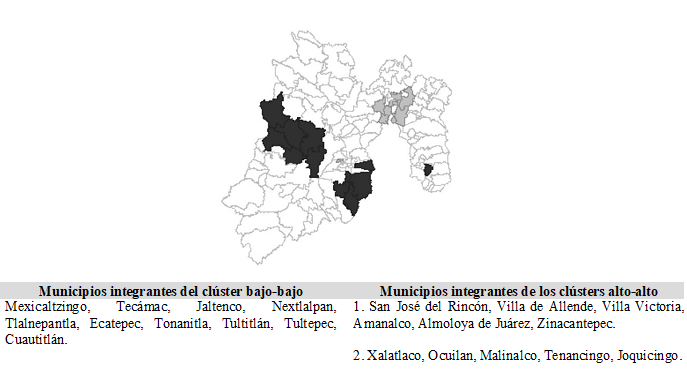 El clúster bajo-bajo referente al nivel de ingresos presenta una particularidad: se ubica en la parte oeste de la entidad, de norte a sur, de manera que abarca un gran número de municipios; ello indica que, en esta región (con los municipios más alejados de la capital del país), la autocorrelación espacial define que los territorios con bajos niveles de ingresos están vinculados con vecinos en la misma condición. Por el contrario, los altos niveles de ingresos se aglutinan en la región metropolitana del Valle de México, donde se concentra la mayor dinámica económica de la entidad (Mapa 10).