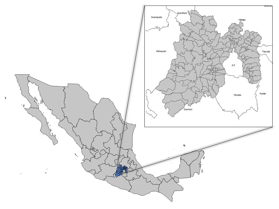 Ubicada en la región centro-sur del país, el Estado de México limita al norte con Querétaro, al noreste con Hidalgo, al este con Tlaxcala, al sureste con Puebla, al sur con Morelos y Ciudad de México, al suroeste con Guerrero y al oeste con Michoacán (INEGI, 2015c), por lo que cuenta con una incomparable accesibilidad al mayor mercado a nivel nacional, así como a los diferentes puntos de enlaces comerciales del país (ver Mapa 1). Se localiza geográficamente entre los paralelos 18º 21’ y 20º 17’ de latitud norte y 98º 36’ y 100º 36’ de longitud oeste, a una altura de 2 683 metros sobre el nivel del mar en su planicie más elevada, el Valle de Toluca (Inafed, 2010).