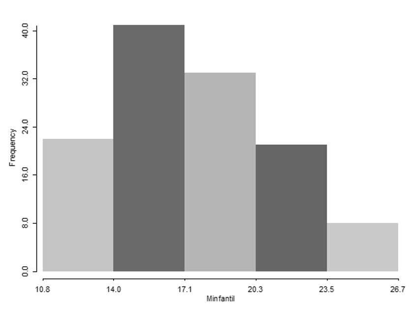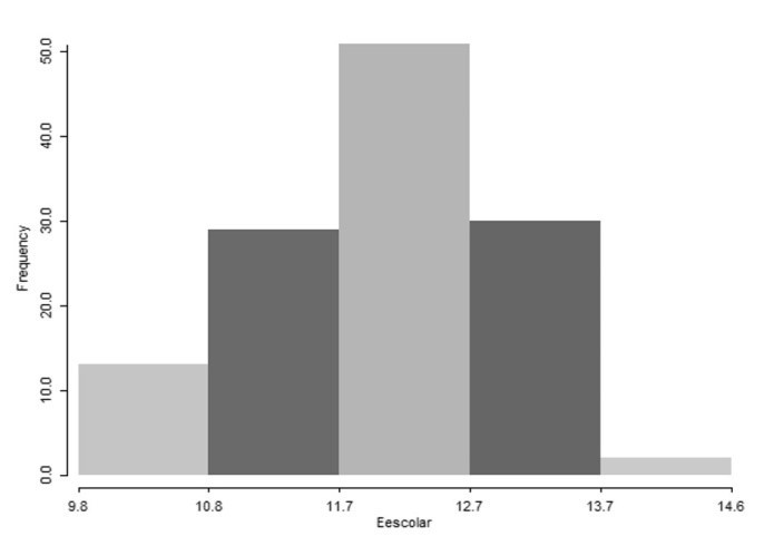 Asimismo, se muestran los años esperados de escolaridad: incluye la población que asiste a la escuela entre 6 y 24 años; el histograma de frecuencias refleja una distribución normal, concentrado en torno a la media, 12.03 años en promedio, lo que a futuro representaría una mejora sustantiva de las capacidades de la población (INEGI, 2010). No existe mucha dispersión de los datos pues la desviación estándar es poco menor a un año (0.9689), como se expresa en la Gráfica 3.