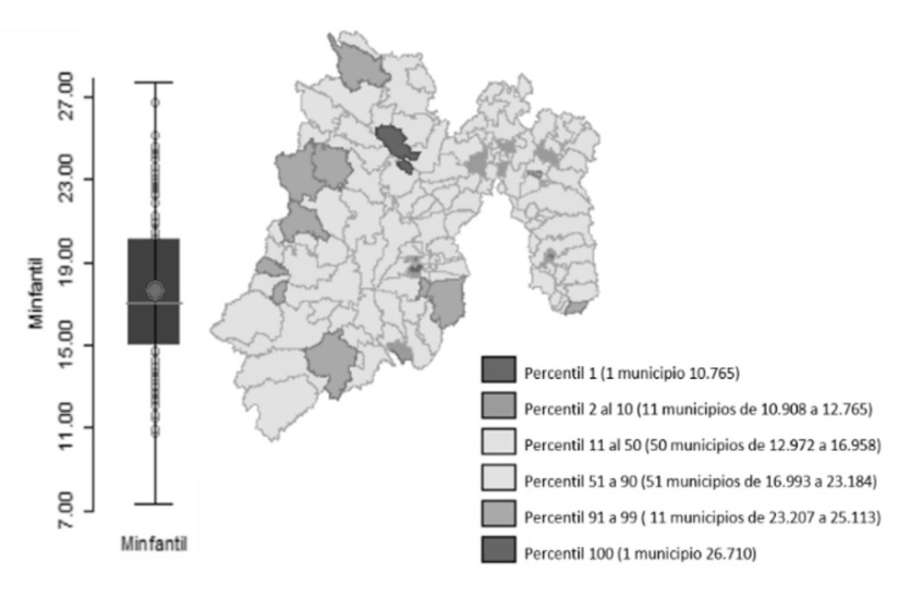 El diagrama de caja expresa que no existen datos atípicos (outliers), mientras en el mapa de percentiles (Mapa 2) se muestra con color más obscuro, en el norte, a Morelos, el municipio con la mayor tasa de mortalidad infantil (26.71), y de color más claro, a San Antonio la Isla como el de menor tasa con 10.76 (Conapo, 2013).