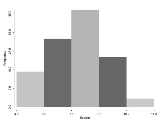 En primer lugar, se abordó el grado de estudios de esta entidad: 7.104 años, en promedio, dos años por debajo de la media nacional, que es de 9.1 (INEGI, 2015c). El histograma de frecuencia de este indicador presenta un sesgo a la izquierda, lo que significa que existen más municipios con menos años de escolaridad que la media estatal; tal rango implica un fenómeno preocupante: 7.8 años de diferencia, como se representa en la Gráfica 2 (INEGI, 2010).