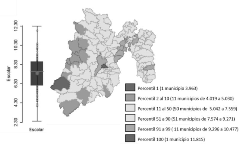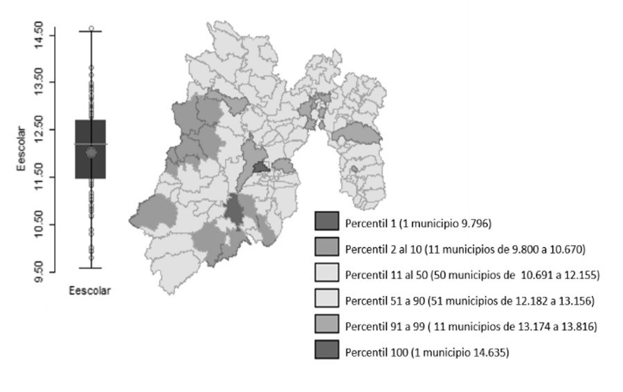 El municipio con superior nivel educativo es Metepec (11.815 años), de color más obscuro en el Mapa 3; pese a no ser considerado un outlier, destaca en la parte superior del diagrama de caja, con 1.3 años de escolaridad más que el segundo lugar estatal (Coacalco de Berriozábal). En el extremo contrario se localiza Luvianos, al suroeste de la entidad, con 3.9 años (de color más claro), lo que implica que los habitantes de este territorio solo tienen la mitad del nivel básico de educación, muy por debajo de la mitad del promedio de instrucción nacional: educación básica y media terminada (INEGI, 2010).