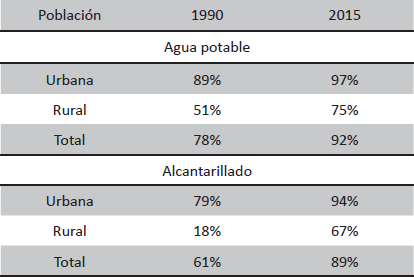 Al parecer se ha incrementado el bienestar de 1990 a 2015: el acceso de la población al agua potable pasó de 78% a 92% y el alcantarillado público se incrementó de 61% a 89%; pero, al revisar los datos de los municipios rurales, la cobertura de alcantarillado es de 67% y el acceso al agua de 75% para el 2015 (véase cuadro 2), aún faltan mucho trabajo por hacer.
