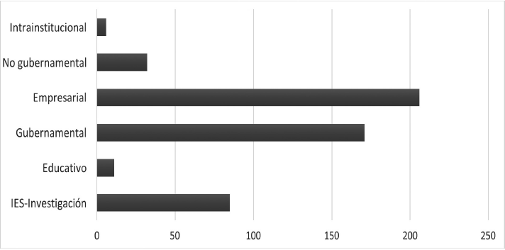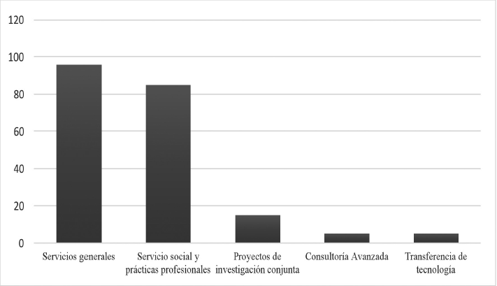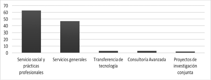La modalidad de vinculación más frecuente, mencionada por todos los directores, es la investigación por convenio, bajo contrato o por pedido. Este resultado es consistente con los hallazgos de otros estudios como la CEPAL (2010) y De Fuentes y Dutrénit (2012).
