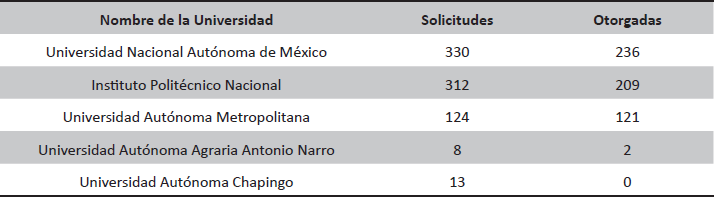 Las mayores dotaciones de recursos de las universidades nacionales también se reflejan en algunos activos intangibles como las patentes, los cuadros (1 y 2) proporcionan una imagen del potencial en conocimiento de las universidades nacionales y estatales. Sin embargo, no todas las patentes concedidas se dan en licencia, esto depende de la demanda de los usuarios potenciales; es decir, de las empresas que escalarían y explotarían la tecnología; en este sentido, una universidad puede ser propietaria de una patente aunque jamás se otorgue en licencia. En cierta medida, la demanda de la propiedad intelectual universitaria depende de qué tan avanzado, tecnológicamente, sea el sector productivo.