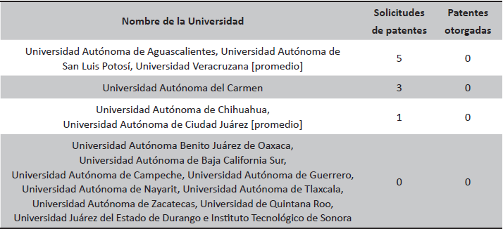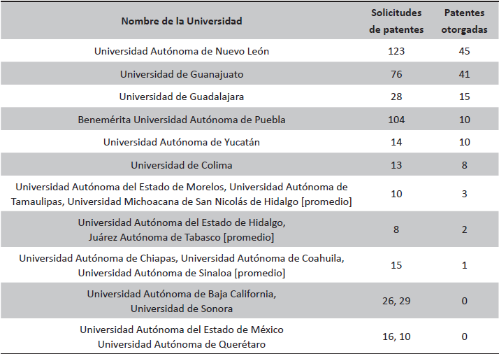 Estas entidades han destacado por el impulso de la industria: Nuevo León, Jalisco y Puebla; junto a otras que, recientemente, han crecido por encima de la media nacional como Guanajuato, Baja California y Sonora, también sobresalen por tener las universidades públicas con la mayor actividad en cuanto a solicitudes de patentes. No obstante, el número de solicitudes y de títulos concedidos, aún, está lejos de ser suficiente para influir en la dinámica industrial.