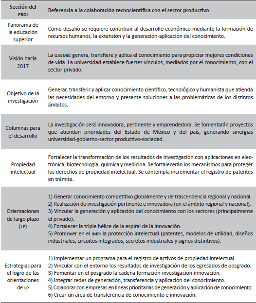 El PRDI de la UAEMÉX aporta otros elementos para sostener que el fomento de la colaboración con las empresas ha estado presente en las últimas administraciones de esta casa de estudios; no obstante, el reto es ir más allá del establecimiento de convenios o acuerdos dentro de las actividades económicas convencionales; por tanto, el compartimiento o la transferencia de conocimiento tecnocientífico es todavía un desafío.