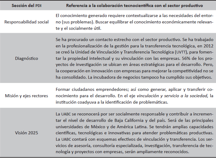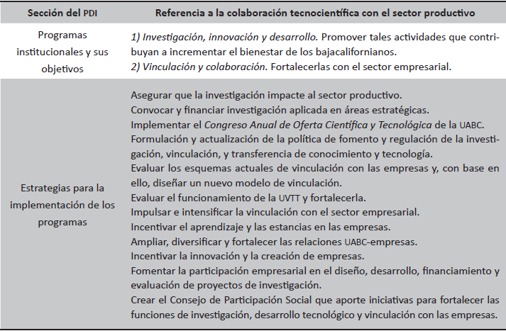 Otra manera de acercarnos a la perspectiva institucional de la UABC, respecto a la interacción tecnocientífica con el sector productivo, es conocer lo que se establece en el Plan de Desarrollo Institucional (PDI) [ver cuadro 4], repasemos los elementos más representativos: