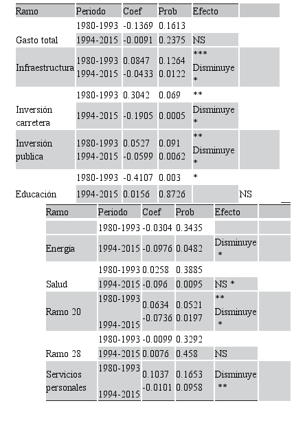 El análisis nos permite identificar los cambios en el gasto en dos periodos distintos con lógicas económicas distintas, de tal manera que el cambio estructural de la economía mexicana se refleja en esos años analizados. Se inicia con una primera observación en un periodo de 1994 a 2015 y un sesgo a favor de la teoría de la compensación del gasto. Al extender el periodo a 1980-1993 es posible formar una imagen más completa de los cambios a largo plazo producido por el incremento de la globalización; esta extensión de las observaciones es más que una decisión técnica, es esperado que los complejos cambios en la política económica tomen tiempo en reflejarse.