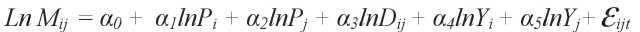 En consecuencia, basándonos en el modelo de gravedad y en lo establecido en la literatura sobre migración (por ejemplo, Andrienko y Guriev [2004], Greenwood [2005], Bunea [2012] y Flores y Hoque [2013]), la ecuación (1) refleja la formulación elemental del modelo de gravedad en su forma matemática: