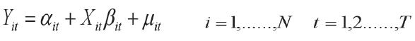 (4)Donde Yit es la variable escalar dependiente, Xit es el vector K x 1 de variables independientes, µit es el termino escalar del error, i son los índices por estudiar (países, empresas, personas) y t es el índice de tiempo en una sección transversal.