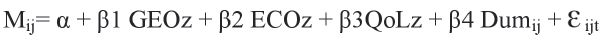 GEO se refiere a las características geográficas, básicas y esenciales del modelo de gravedad, siendo distancias físicas. ECO especifica las condiciones económicas de las regiones. QoL detalla las condiciones sociales o calidad de vida de la población, y por último Dumij es una variable de costo y vínculo entre origen y destino. Aunque, en el espíritu del modelo de gravedad tradicional, incluimos las características de destino, z = j (factores de “atracción”) y las características de origen, z = i (factores de “empuje”); se ha demostrado que los factores con más peso en la decisión de migrar son los factores de atracción (Faggian, 2005).