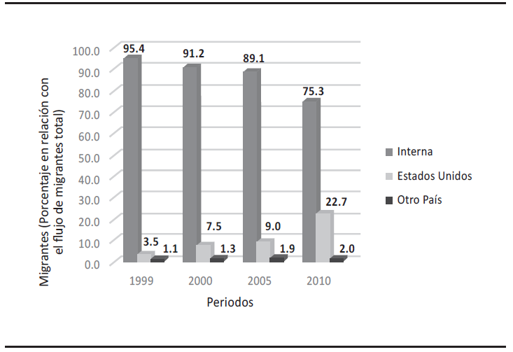 La gráfica 1 muestra datos de migración para el periodo de 1990 a 2010. Se aprecia que, de la migración total del país, más del 90% corresponde a la migración interna. En el 2010 los desplazamientos entre regiones disminuyeron notablemente aumentando los valores de migración hacia Estados Unidos por encima del 13% con respecto a periodos anteriores; a pesar de esto, las estadísticas muestran que en promedio en los últimos veinte años la migración interna es seis veces mayor con respecto a la internacional.