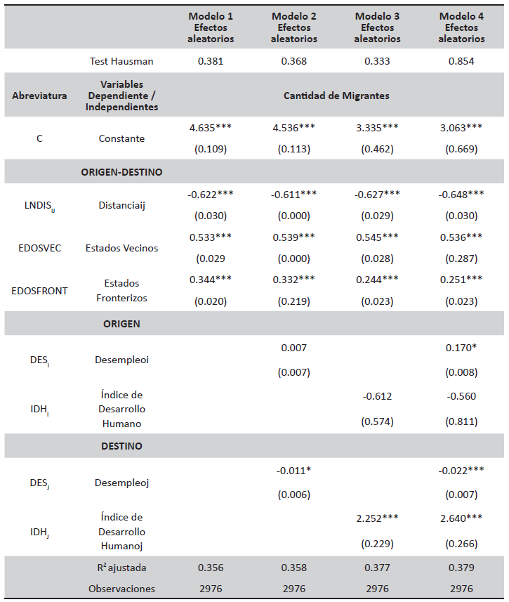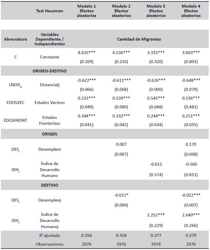 En el cuadro 1 se muestran cuatro regresiones que estima de forma individual y conjunta los factores de gravedad, factores económicos, indicadores de calidad de vida, variables ficticias y de costos de migración. En el modelo 1 se evalúan las variables del modelo básico de gravedad, omitiendo el factor de población, por la alta correlación que tiene con la variable dependiente. En la regresión 2, se amplía el modelo básico, incluyendo las variables económicas, aproximadas por la tasa desempleo y referenciada como factor de expulsión en las regiones de origen y medida como indicador de atracción migratoria en las entidades destino. En la siguiente estimación se despliegan los resultados de la regresión asociando el índice de desarrollo humano (IDH) en ambos sectores del análisis, pero excluyendo las variables económicas. Finalmente, en el modelo 4 se presenta la ecuación de gravedad extendida, incluyendo todas las variables de estudio.