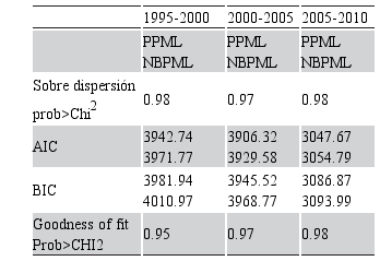 Para realizar este análisis se sigue de cerca la metodología descrita en Flores y Hoque (2013), que detalla el planteamiento de modelos de Poisson y Binomial Negativa, PPML y NBPML respectivamente. Para identificar cuál de las dos especificaciones es adecuada, se estiman los modelos PPML y NBPML y se analizan los resultados mediante el estadístico de sobre-dispersión, y los criterios de información Akaike (AIC), bayesiano (BIC) y Goodness of Fit. La hipótesis nula en la prueba de sobre-dispersión es que el modelo Poisson es el adecuado. Para las pruebas AIC y BIC la especificación preferida presenta el menor valor estadístico.