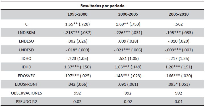 En relación con las variables ficticias, la variable de costos que atribuye a la migración entre estados vecinos (EDOSVEC), al igual que el IDHD, presenta signo y significancia estadística en todos sus ámbitos, pero muestra una disminución en su impacto conforme pasan los años, solo que en el ciclo medio tiene una mayor caída con respecto al actual. Al revisar los parámetros de la variable dummy de estados fronterizos (EDOSFRONT), a pesar de tener resultados cercanos a cero, demuestra un aumento en sus coeficientes de 0.04 a 0.09 manteniendo este último valor en los dos últimos periodos, desafortunadamente no presenta significancia estadística en ninguna de sus estimaciones.