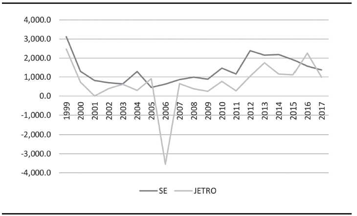 Con la entrada en vigor del Acuerdo de Asociación Económica MéxicoJapón, los flujos de IED japonesa a México aumentaron de manera importante. La participación de Japón en la IED que llega a México ha crecido considerablemente en los últimos años, la gráfica 1 muestra estadísticas oficiales de flujos de IED japonesa en México. En la gráfica, se observa un crecimiento importante en la IED japonesa después del 2011, lo cual corresponde con la llegada de empresas niponas al sector automotriz en México, principalmente a la región del Bajío mexicano (Aguascalientes, Guanajuato y Querétaro). Entre el 2003 y el 2013, los flujos de inversión japonesa crecieron a tasas por arriba del 20% anual y alrededor del 70% se concentró en la industria automotriz (Secretaría de Economía, 2017).