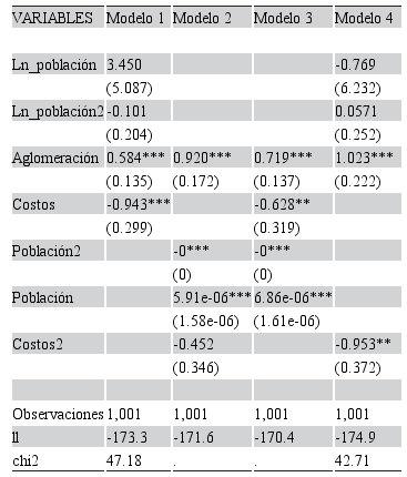 En el modelo tres, la variable población resulta estadísticamente significativa al 99% y con signo positivo, confirmando la importancia del tamaño del mercado como factor de localización de empresas japonesas proveedoras. La variable población al cuadrado se incluyó para probar si existía un efecto cuadrático de la población sobre la posibilidad de elección, resulta también significativa, pero con signo negativo, confirmando la hipótesis de rendimientos decrecientes. El factor aglomeración también resulta estadísticamente significativo al 99% y con signo positivo, esto de acuerdo con aspectos teóricos y empíricos previos relacionados con IED japonesa y reafirma la preferencia de firmas niponas por ubicarse en centros productivos aglomerados. Por último, el factor costos presentó signo negativo y fue significativo al 95%, señalando que los costos laborales influyen de manera negativa en la ubicación industrial de las empresas japonesas en México.