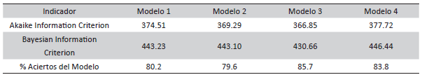 En total se estimaron cuatro modelos en diferentes variantes (ver tabla 1). Para identificar el mejor modelo se utilizaron los criterios de información Akaike y Bayesiano de Schwartz (ver tabla 2). Los resultados señalan que el modelo tres consigue mejores resultados para ambos criterios, en comparación con las demás estimaciones.