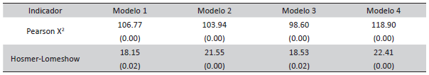 Por último, se estimaron indicadores econométricos de bondad de ajuste. Los resultados se presentan en la tabla 2. De acuerdo con el criterio de AIC y BIC, bajo la estimación ASCL, el modelo 3 se ajusta mejor a los datos, además otorga un porcentaje mayor de aciertos con respecto a las estimaciones probabilísticas encontradas. Finalmente, se corrieron las regresiones de los cuatro modelos bajo la estimación de regresión logística y se presentan las medidas de bondad de ajuste para esas regresiones (ver tabla 3). Siguiendo los criterios de las pruebas de chi-cuadrado de Pearson y Hosmer Lomeshow, bajo las regresiones logísticas no existen evidencias para rechazar la Hipótesis nula y podemos concluir que estos modelos no se ajustan de manera adecuada a los datos.